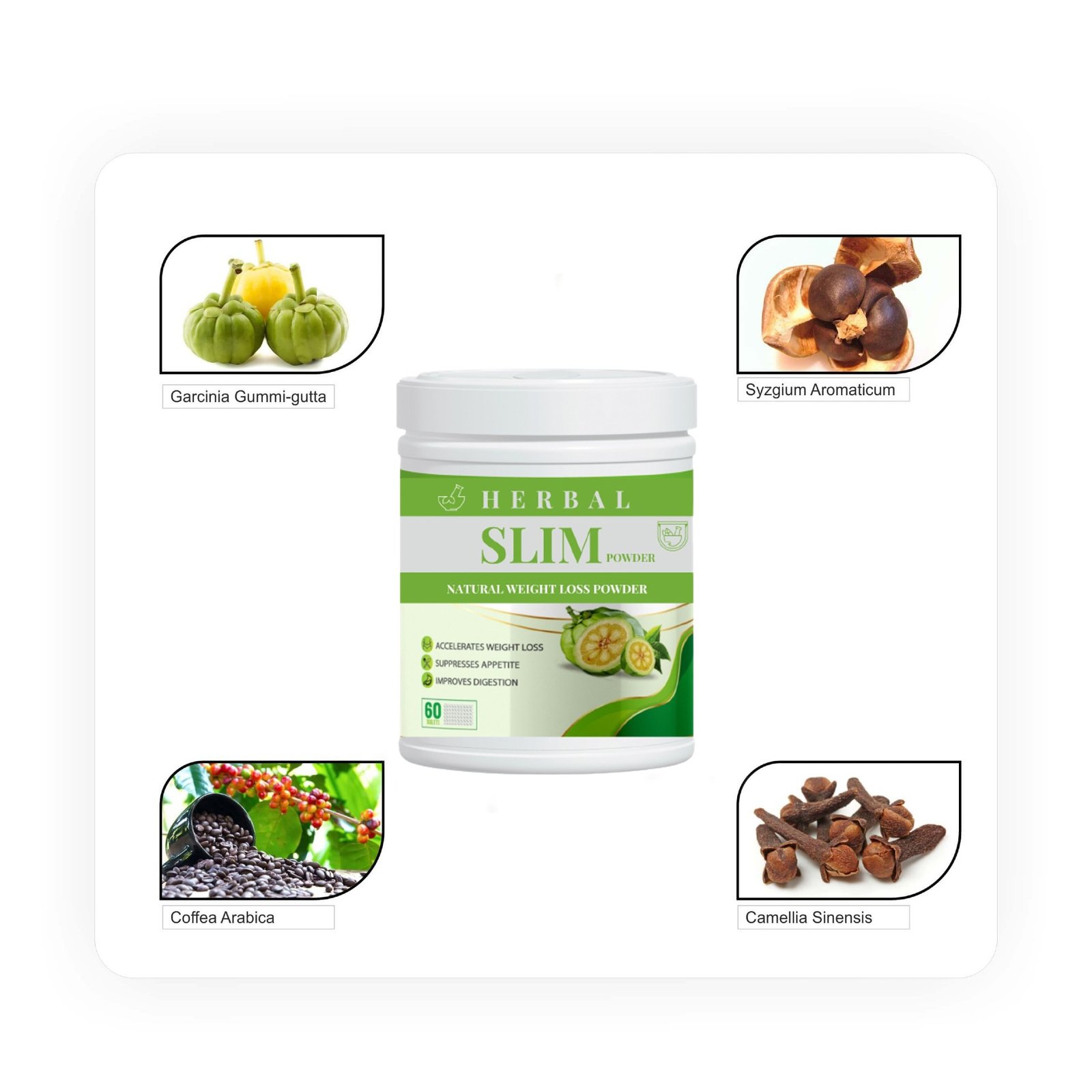 HERBAL SLIM POWDER या पेटंट केलेल्या मिश्रणात दोन घटक आहेत जे तुम्हाला लवकर पतळ होण्यात मदत करण्यासाठी एकत्र काम करतात.